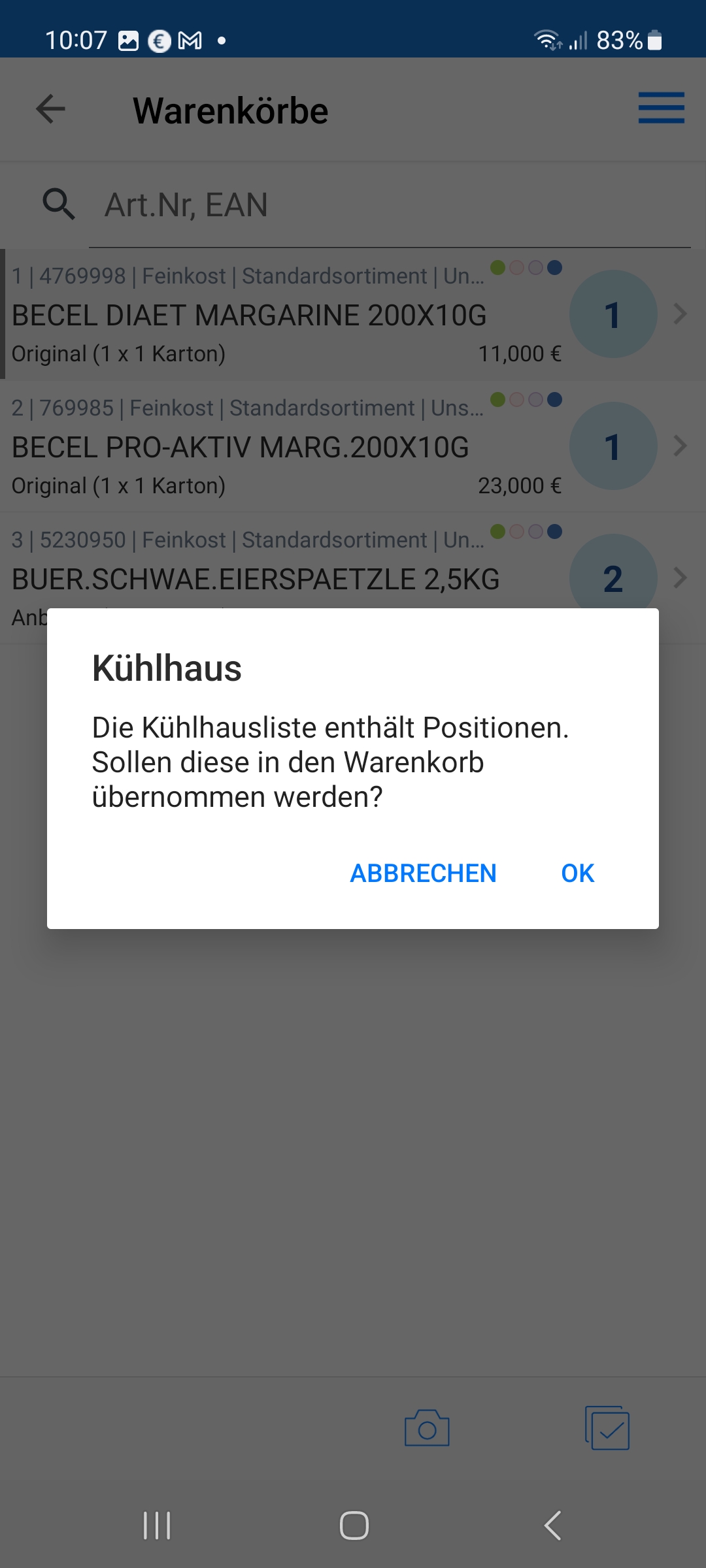 Haben Sie Artikel auf die Kühlhausliste übernommen, werden beim Wechsel in den Bereich Warenkörbe Ihnen nur