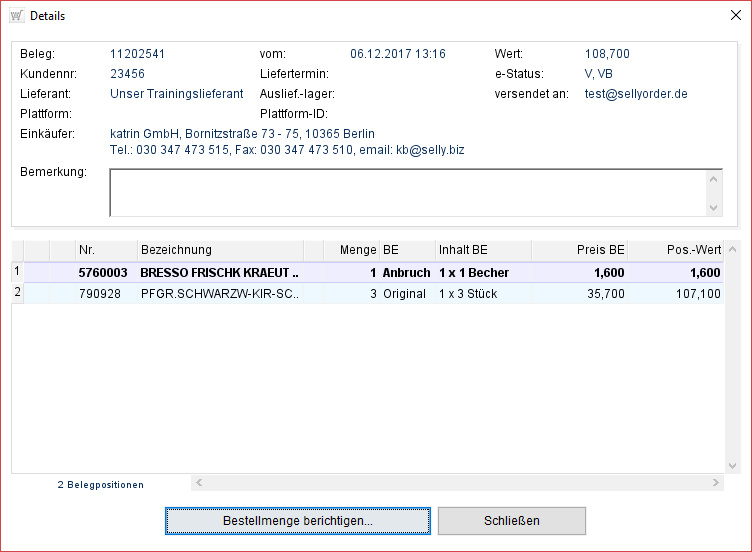 Eine Korrektur der ursprünglichen Menge zur tatsächlich gelieferten Menge nehmen Sie über die Schaltfläche [Bestellmenge berichtigen...] vor (s. Mouseover im Bild).