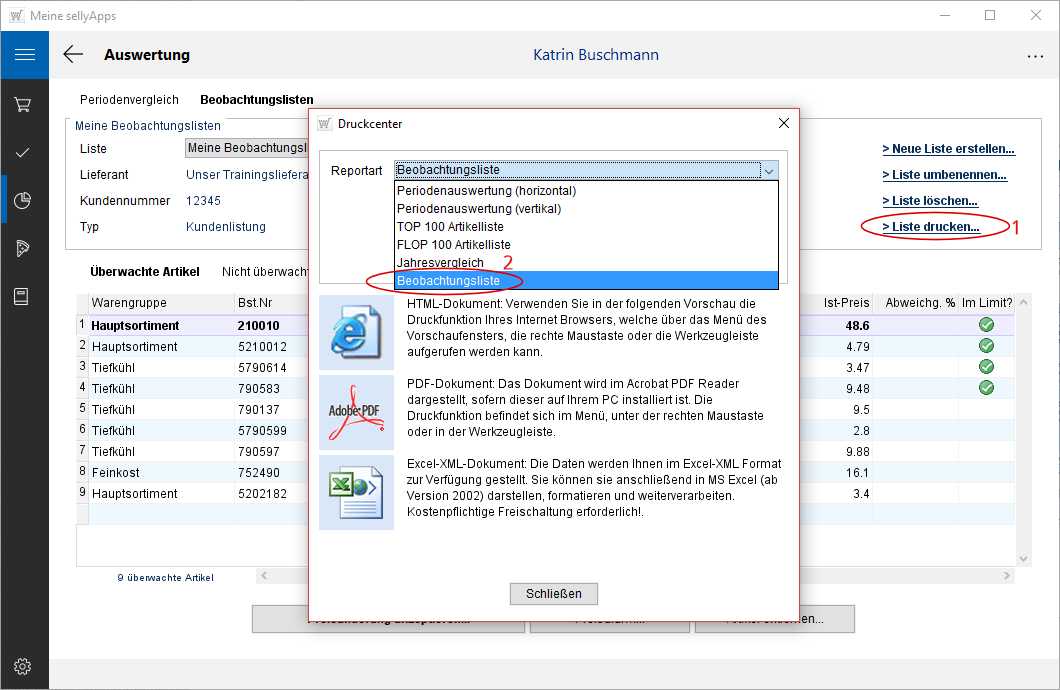 Mit Anwahl des Links Liste drucken (s. Markierung 1) erhalten Sie das Druckcenter.