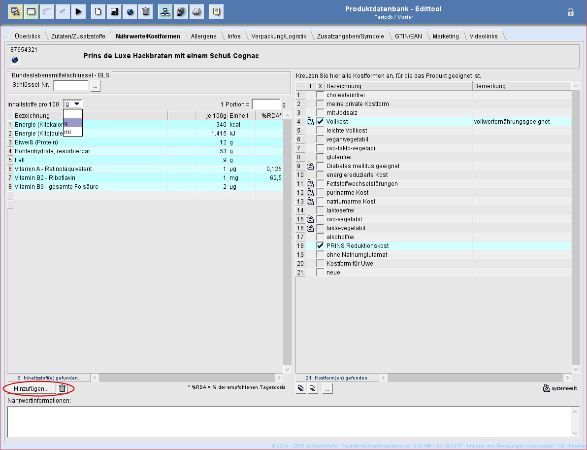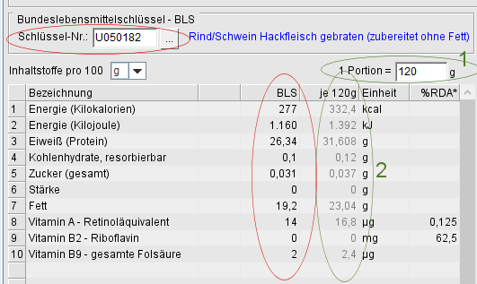 Die Nährwerte für das darzustellende Produkt können Sie ebenfalls über einen auswählbaren BLS-Schlüssel beziehen.