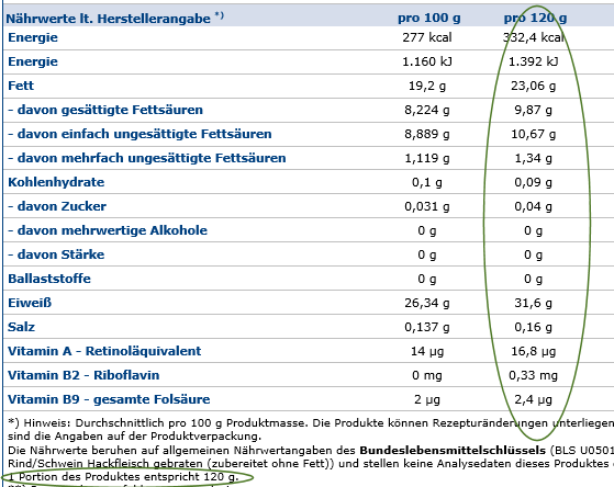 Möchten Sie Nährwertangaben für eine Portion machen, ist dafür die Portionsgröße anzugeben (s. grüne Markierung 1).
