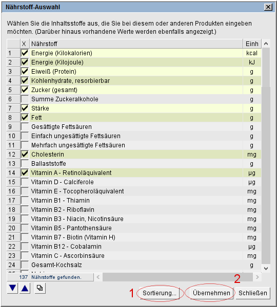 Für eine schnellere Auswahl bzw. bessere Übersicht lässt sich die Nährstoffliste sortieren. Klicken Sie dazu auf [Sortierung...] (s. Markierung 1).