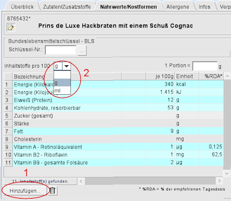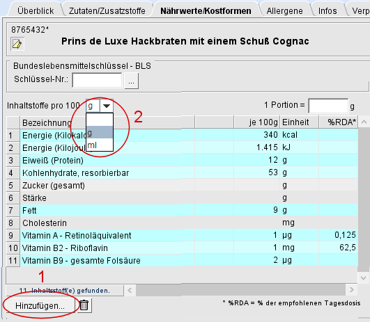 Im ersten Schritt wählen Sie die Bezugsgröße g oder ml aus (s. Markierung 2).