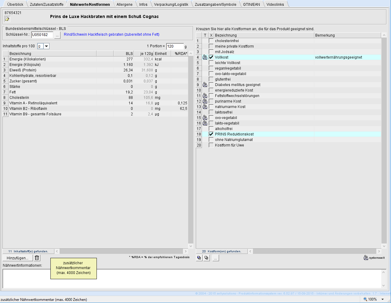Über [Schließen] kehren Sie in den Reiter Nährwerte/Kostformen zurück.