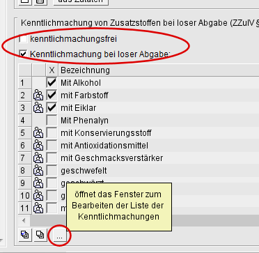 Sollte die Liste nicht alle Zusatzstoffe enthalten, die Sie benötigen, können Sie diese ergänzen. Das Fenster zum Bearbeiten der Zusatzstoffe öffnen Sie über den Schaltknopf