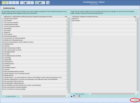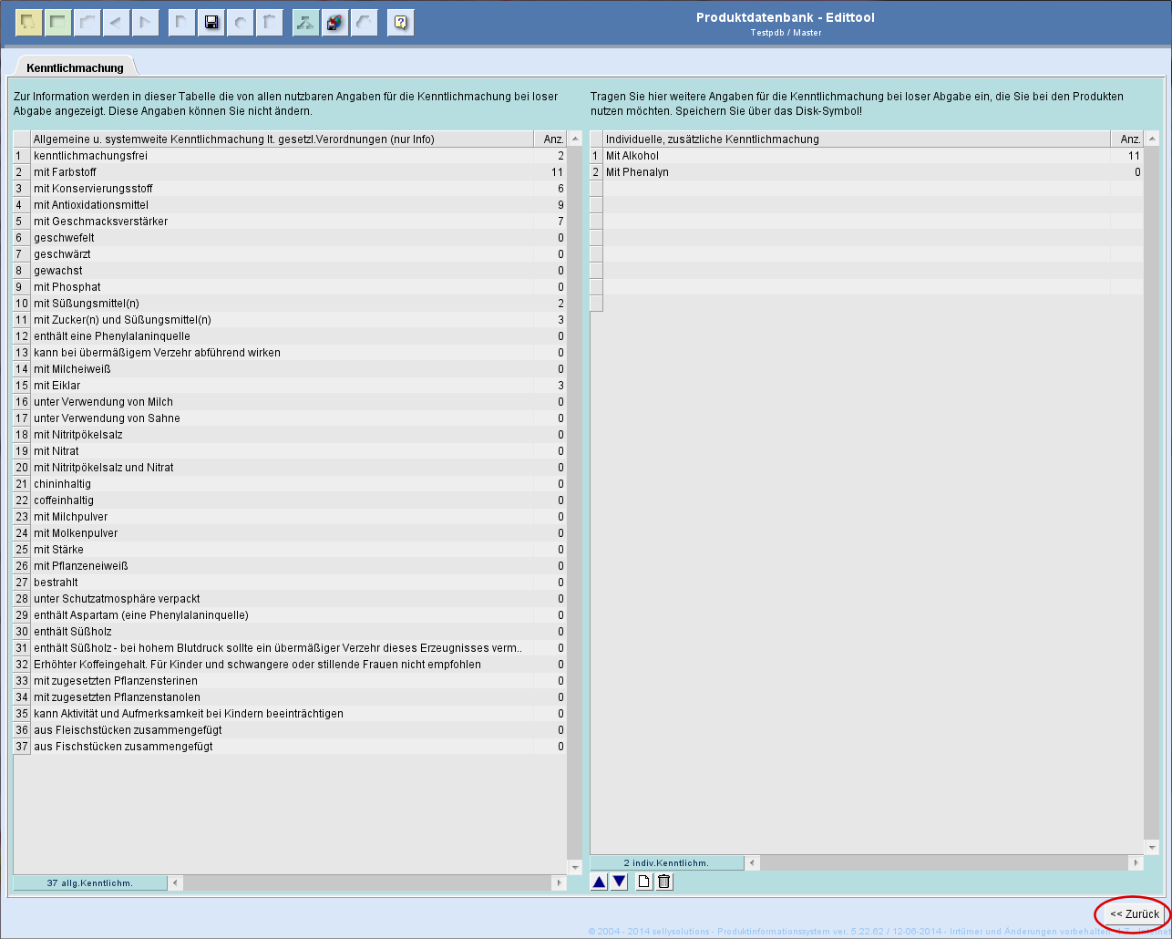 Sie ergänzen, wie im Kapitel Stammdatenpflege-Kenntlichmachung beschrieben, die Liste der Zusatzstoffe für lose Abgabe und kehren mittels Schaltfläche [zurück >>] in den Dialog Zusatzstoffe/Zutaten zurück.