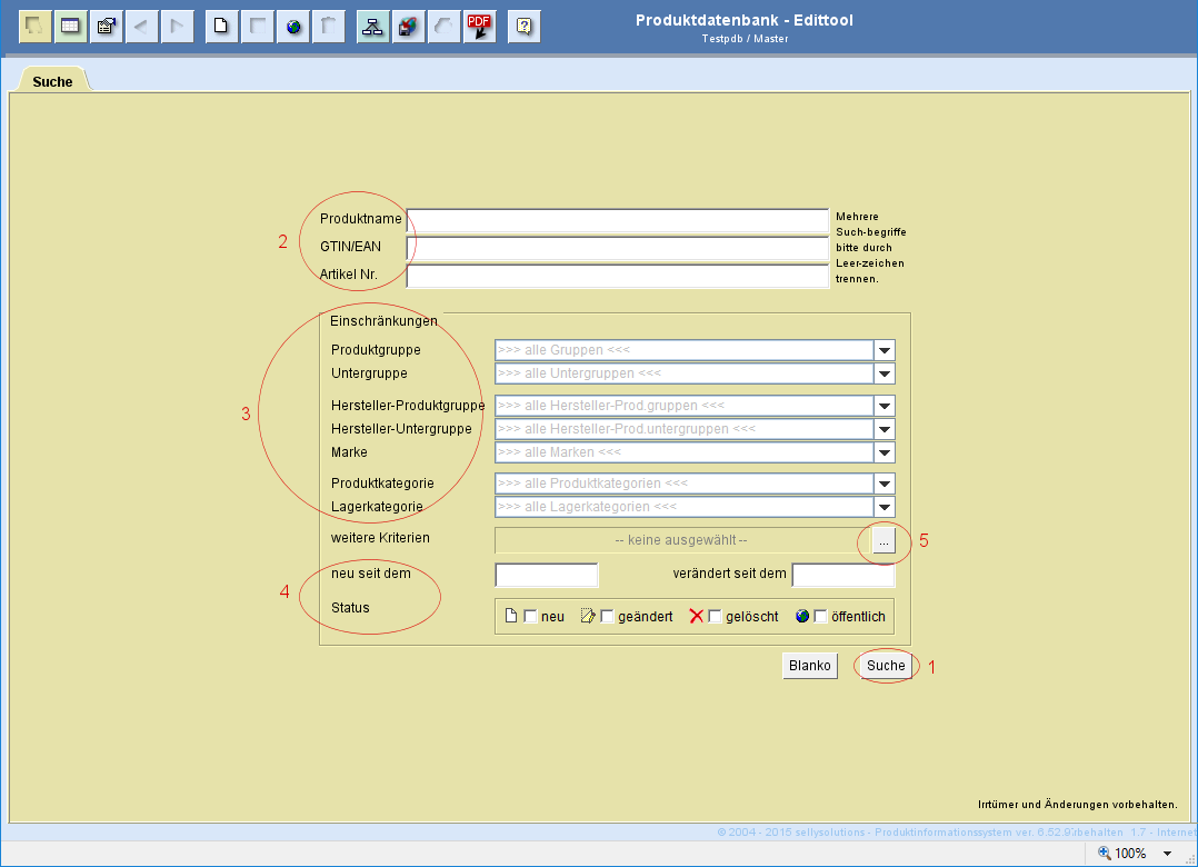 Um bspw. neu angelegte Produkte in der Datenbank zu finden, tragen Sie in das Feld neu seit dem ein entsprechendes Datum ein bzw. nutzen die Checkbox neu. Analog gilt dies für Produktänderungen. Hier verwenden Sie das Feld verändert seit dem bzw. die Checkbox geändert (s. Markierung 4).