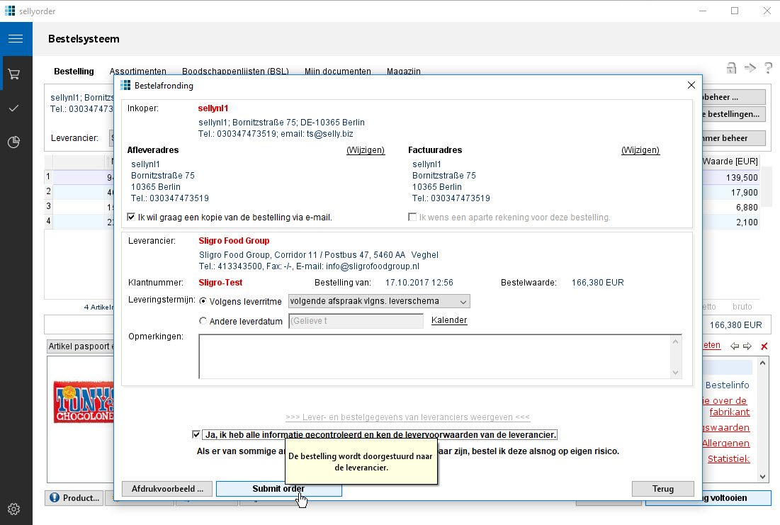 Nu zal er een  venster  getoond worden met de details van de bestelling. Controleer of alles juist is ingevuld, zoals het afleveradres, factuuradres en andere details. Bevestig in de checkbox dat u de bestelling heeft gecontroleerd en klik om de bestelling te verzenden op [Submit order]