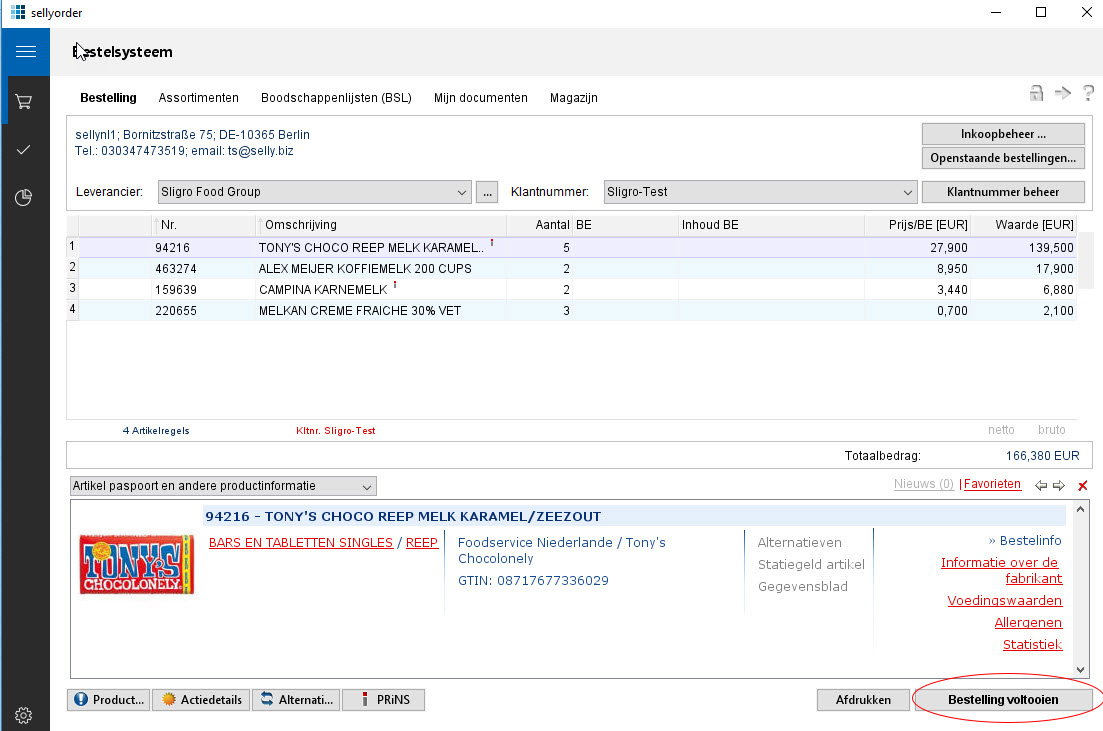 Als u klaar bent klikt u op Bestelling en controleert u de regels.