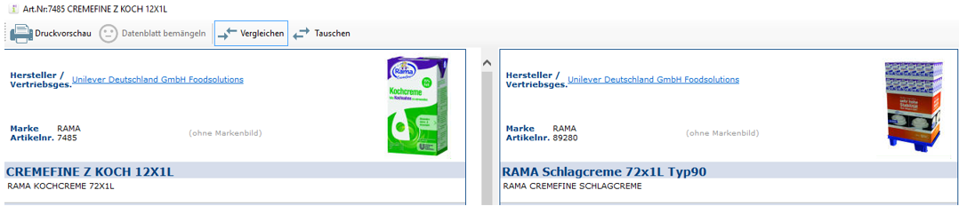 2. Schritt: Rechts wird das Alternativprodukt (RAMA Schlagcreme 72x1L Typ90) zum Vergleich geladen.