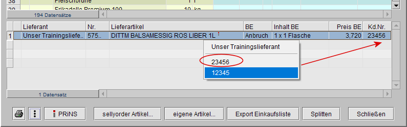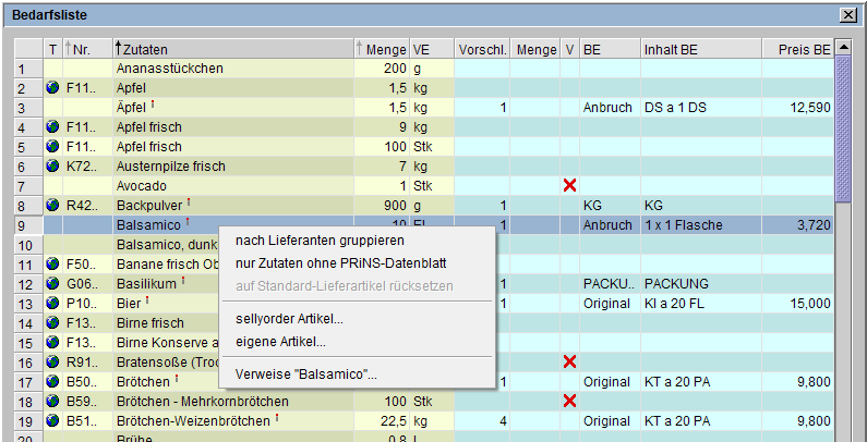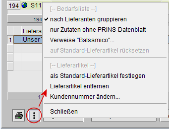Haben Sie mehrere Lieferartikel der Zutat zugeordnet, können Sie hier den Standardlieferartikel definieren. Sie markieren die Lieferartikelzeile und wählen diese Funktion. Der gewählte Lieferartikel wird anschließend in der Liste der Lieferartikel an erster Position gesetzt.
