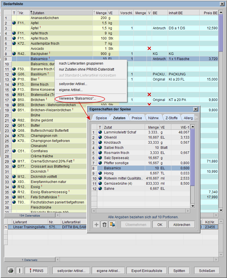 Nach Auswahl der Information (Z4:S5:K3:P8...) öffnet sich die Zutatenliste der Speise (s. Beispielbild Verweise Balsamico).