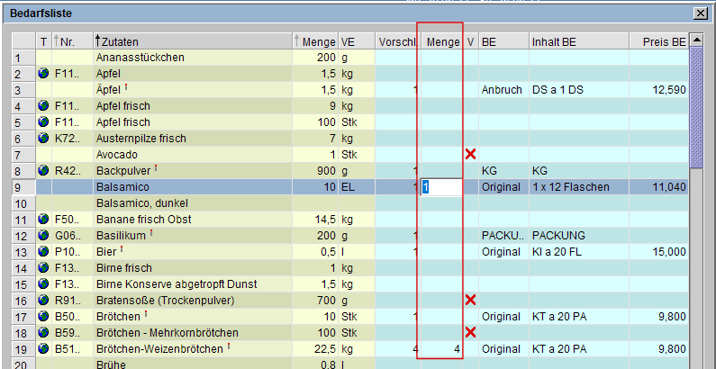 Nachdem Sie auf diese Art alle Zutaten mit entsprechenden Artikeln aus dem Lieferantenkatalog verknüpft haben, tragen Sie die gewünschte Menge für jeden Artikel in der zweiten Mengenspalte (grün) (s. Markierung) ein.