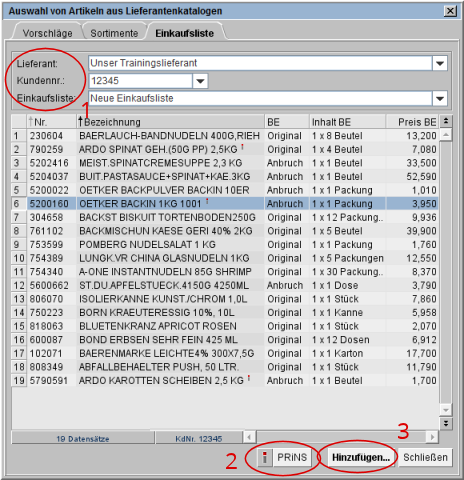 Für die Artikelauflistung können Sie einen Lieferanten, die Kundennummer und die entsprechende Einkaufsliste einbeziehen (s. Markierung 1).