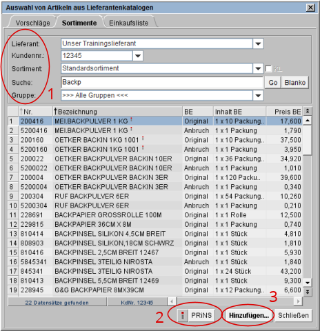 Für einen Suchvorgang können Sie einen Lieferanten, die entsprechende Kundennummer, das Sortiment und Warengruppen einbeziehen (s. Markierung 1).