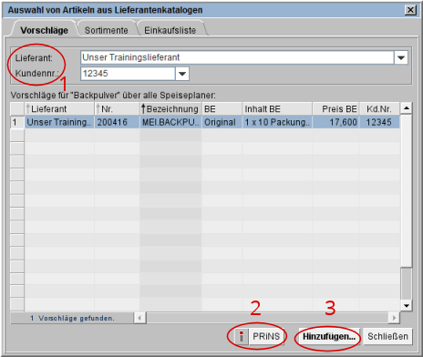 In dem Dialog Auswahl von Artikeln aus Lieferantenkatalogen wählen Sie für Ihre Zutat einen Lieferartikel aus.