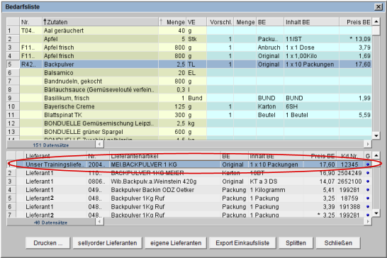Sie sehen jetzt für die Zutat Backpulver in der unteren Tabelle einen Lieferartikel (MEI BACKPULVER 1 KG) zugeordnet.