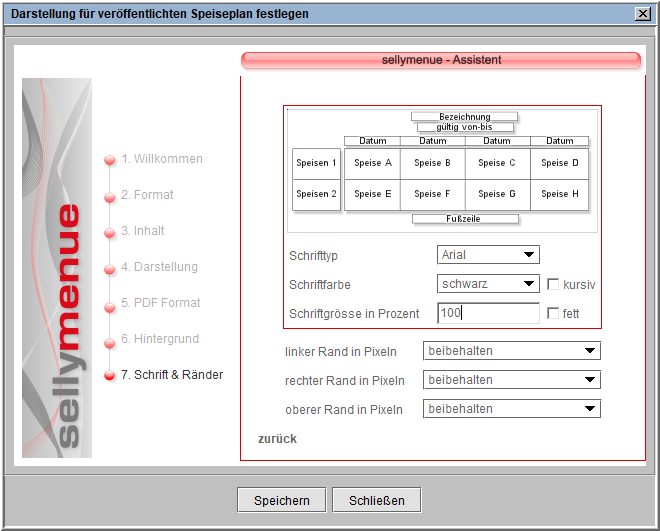 Je nach Hintergrundbild müssen Sie eine Randdefinition vornehmen, damit die Speiseplanangaben nicht das Bild überdecken. Sie haben die Auswahl zwischen 10, 30, 50, 100, 150, 200, 250, 300, 350 und 400 Pixeln.