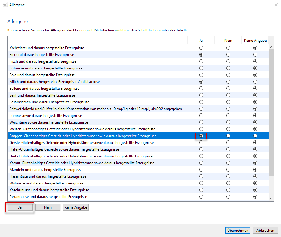 Allergen direkt in der Zeile anklicken bzw. nach Markierung