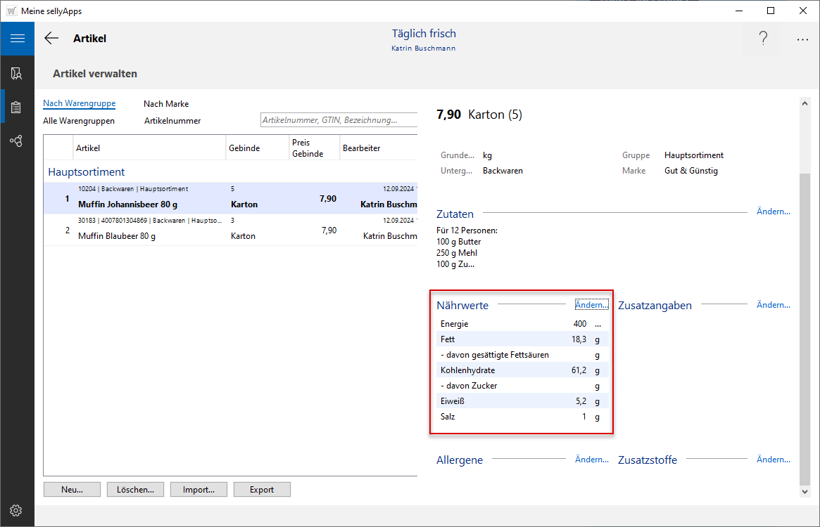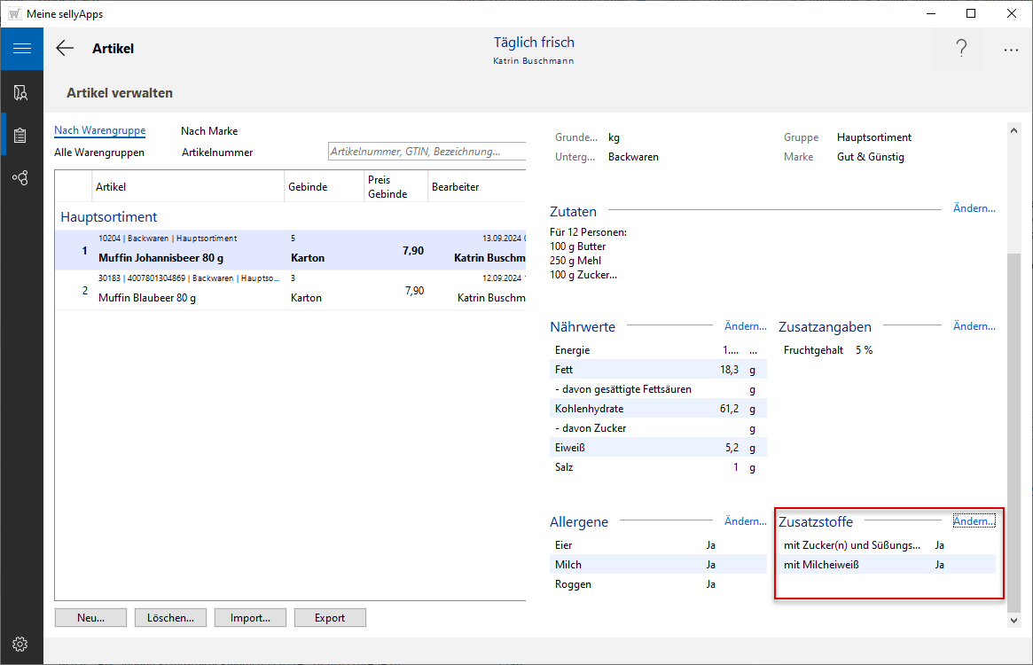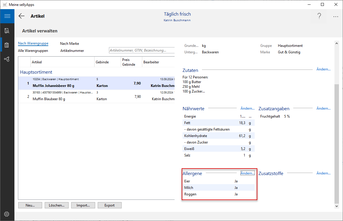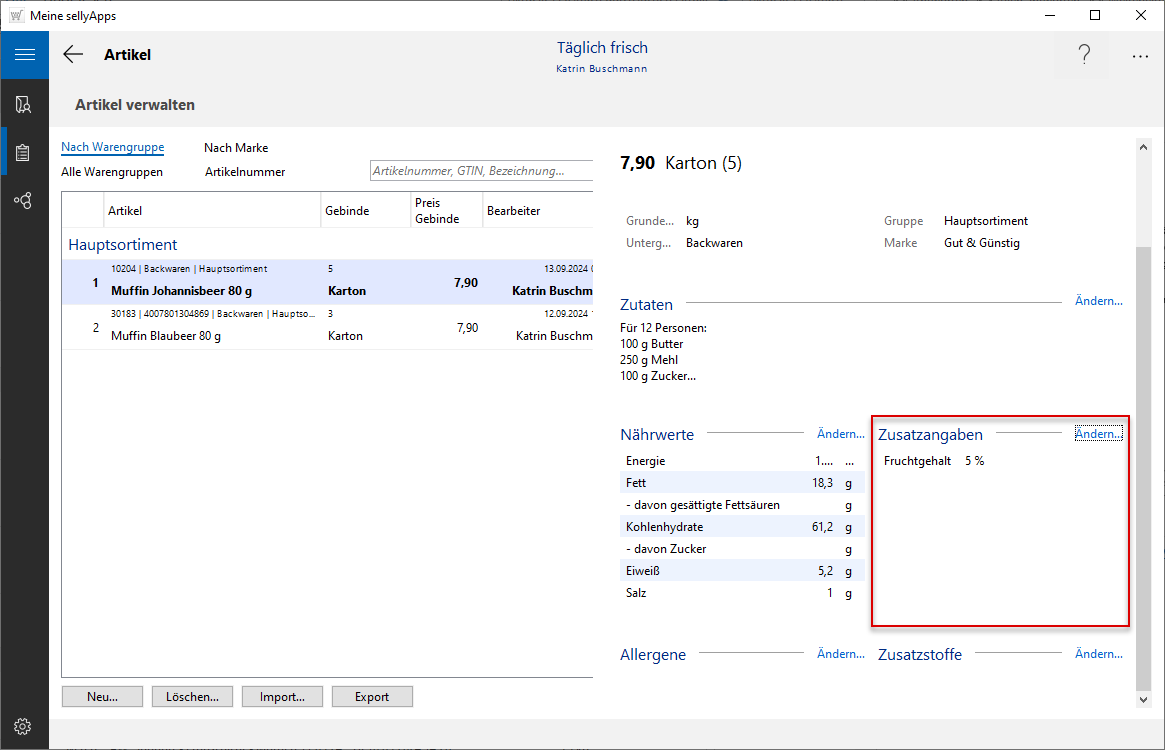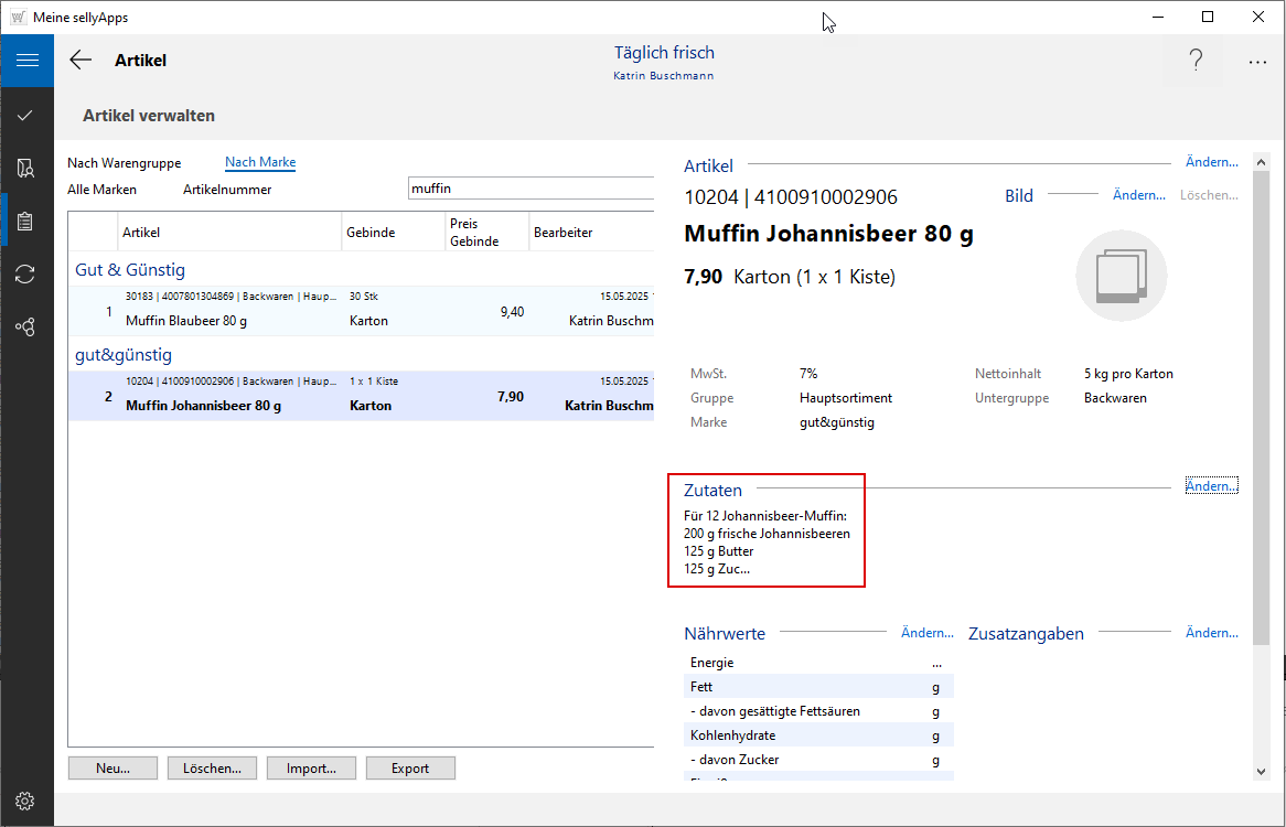 Die Liste der Zutaten und weitere zutatenspezifische Angaben geben Sie als Fließtext in den Bereich Zutaten ein (s. l.). Mittels Schaltfläche [Übernehmen] werden diese Informationen im Artikeldialog angezeigt (s. r.). Wählen Sie [Abbrechen], erhalten Sie keine Nachfrage, somit ist die Eingabe verloren.