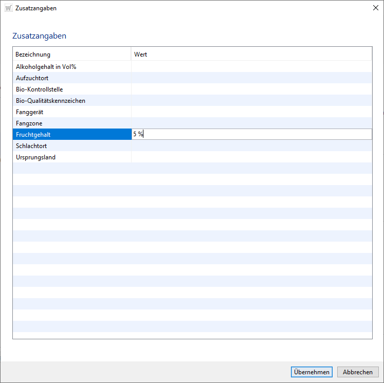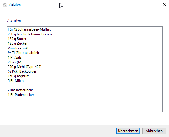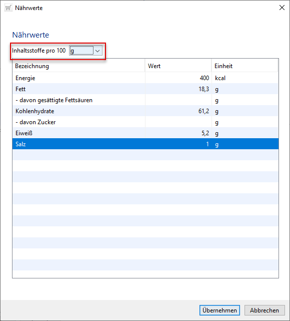 unverarbeiteten Zutaten. Mittels Schaltfläche [Übernehmen] werden