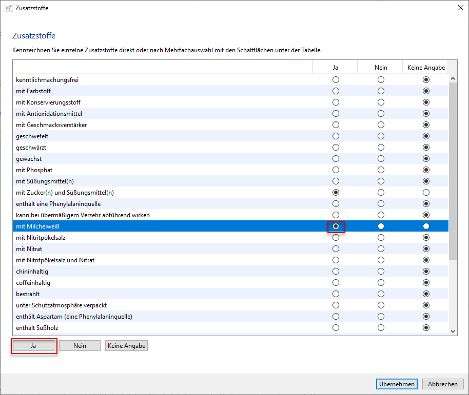 der Zeile bspw. die Schaltfläche [Ja] nutzen (s. l. Markierungen). Übernehmen Sie die Auswahl mittels