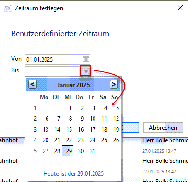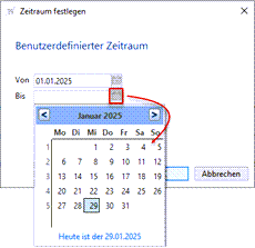 Hierfür wählen Sie im Menü (s. l. Markierung) den Eintrag Zeitraum festlegen... und tragen das zutreffende Datum direkt in die Felder ein oder nehmen eine