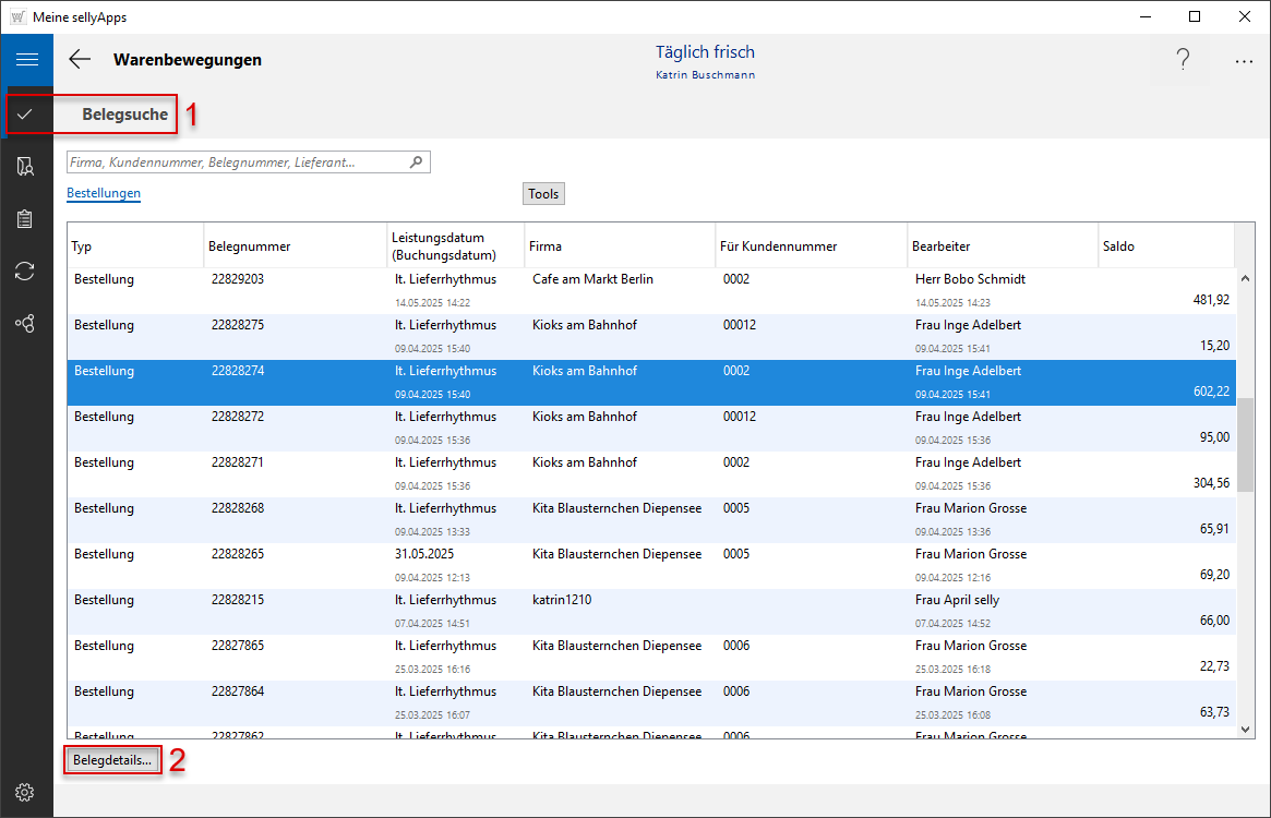 Wechseln Sie in die Belegsuche (s. Markierung 1), können Sie mittels gleichnamiger Schaltfläche jede Bestellung im Detail ansehen (s. Markierung 2).