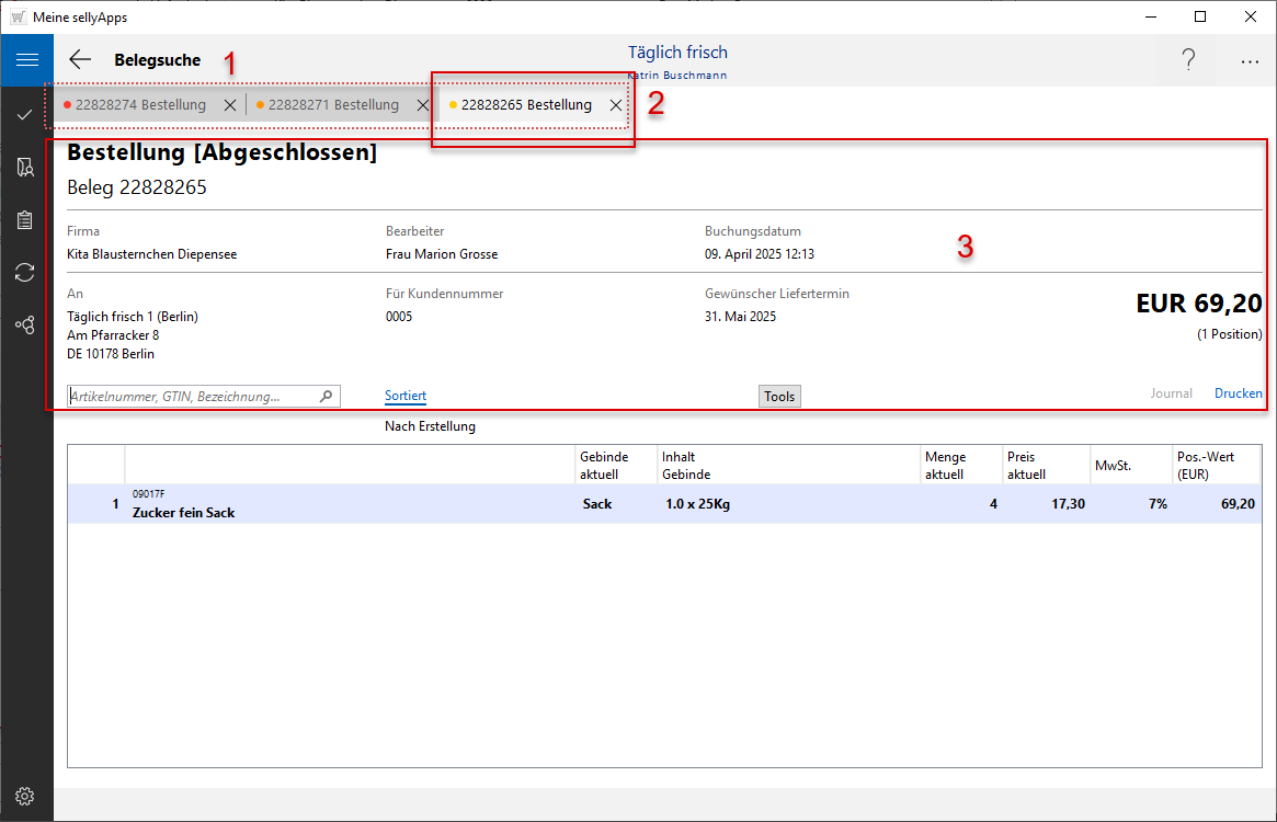 Im Bildbeispiel sind drei Bestellbelege geöffnet (s. Markierung 1). Der aktuell in der Ansicht befindliche Beleg (s. Markierung 2) ist der rechte Eintrag in der sogenannten Reiteranordnung.