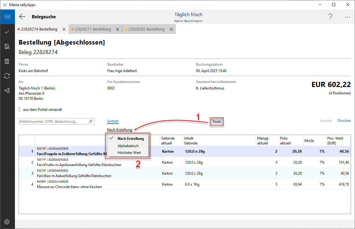 Um die Positionen des Beleges zu sortieren, nutzen Sie die Schaltfläche [Tools] (s. Markierung 1), sehen nachfolgend das aktuell gewählte Sortierkriterium (Bildbeispiel: Nach Erstellung). Klicken Sie den Eintrag (Nach Erstellung) an, erhalten Sie die für eine Sortierung möglichen Kriterien (s. Markierung 2).