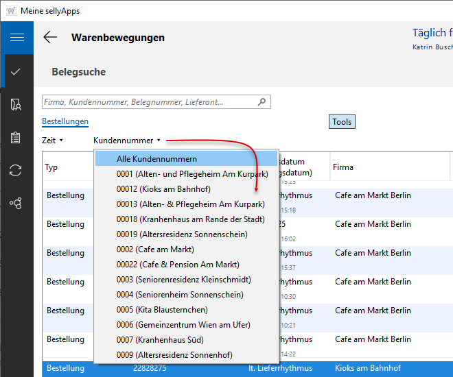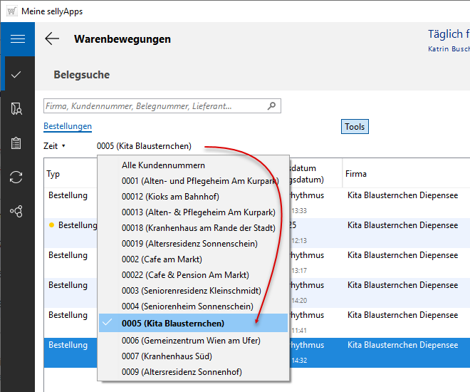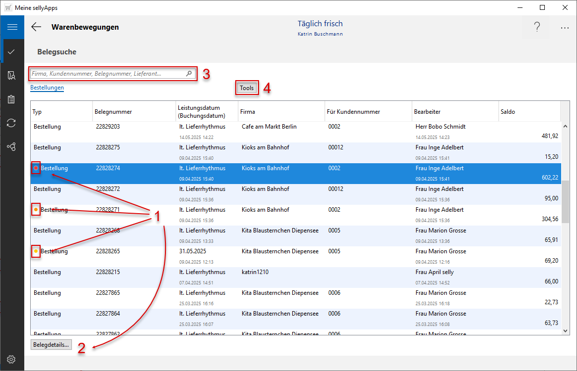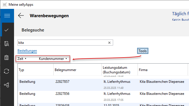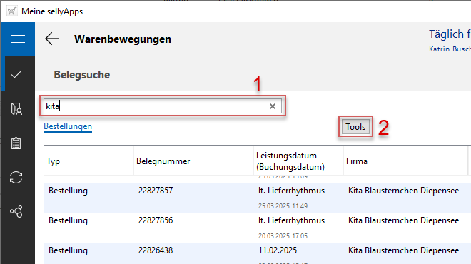 Ist die Belegliste länger, können Sie einen Suchvorgang durchführen, um schneller eine Bestellung Ihres Kunden zu finden. Geben Sie dazu in das Suchfeld einen Suchbegriff (Bildbeispiel unten: kita) ein (s. o. l. Markierung 3) und starten die Suche mit [Enter].