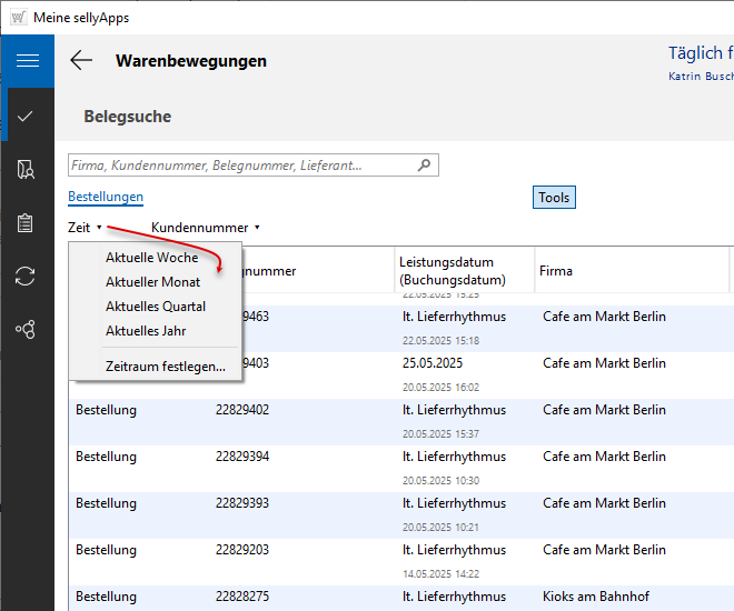 Die Belegliste können Sie auf Belege eines definierten Zeitraums und einer Kundennummer einschränken. Sie nutzen dazu die Schaltfläche [Tools] (s. o. Markierung 4). Sie erhalten die entsprechenden Menüs eingeblendet (s. Mouseover-Bild).