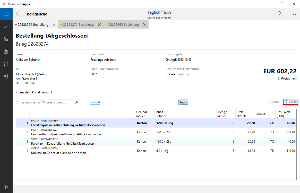 Die Bestellbelege werden, entsprechend ihres Erstellungszeitraums, aufgelistet. Dabei steht der zuletzt erzeugte Beleg oben in der Liste.