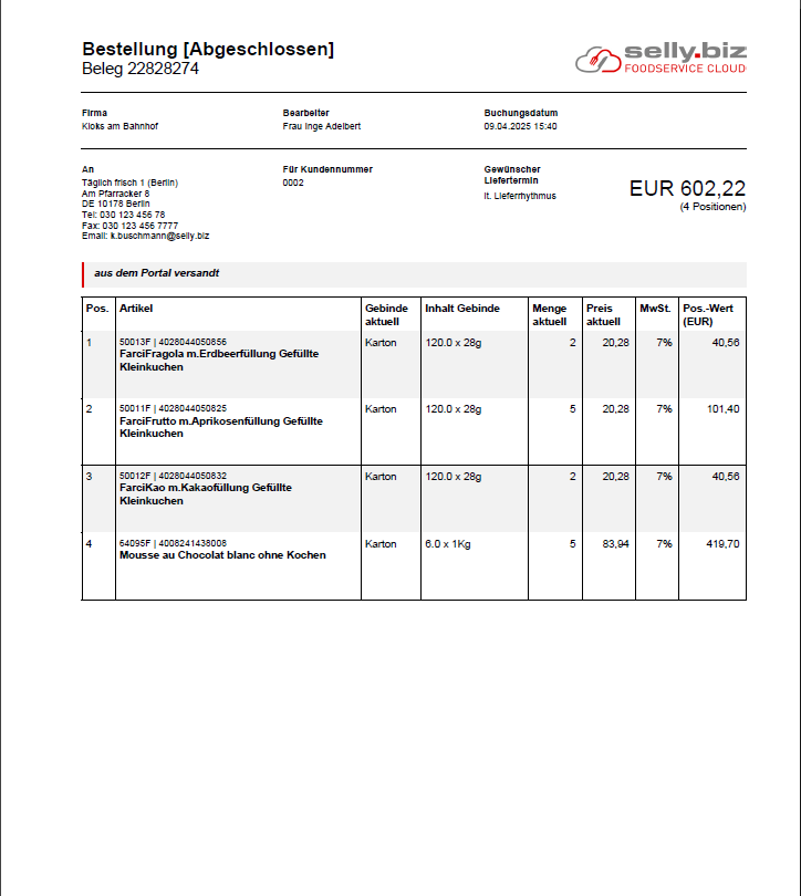 der Belegtyp (Bestellung), die Belegnummer, das Leistungsdatum (Bestelldatum), die Firma (Besteller), die