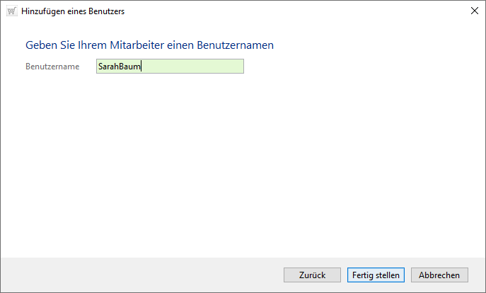 Der letzte Schritt zur Neuanlage von Benutzerdaten für einen Mitarbeiter, ist die Festlegung eines Benutzernamens für die Nutzung von sellyoffer. Dieser ist nach Eingabe des Names und Klick auf [Fertig stellen] erledigt.