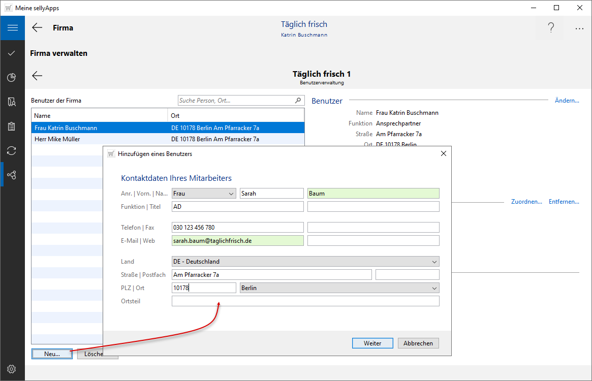 Unterhalb der Tabelle Benutzer der Firma klicken Sie auf die Schaltfläche [Neu...] und erhalten den ersten Dialog, um die Kontaktdaten des Benutzers zu erfassen.