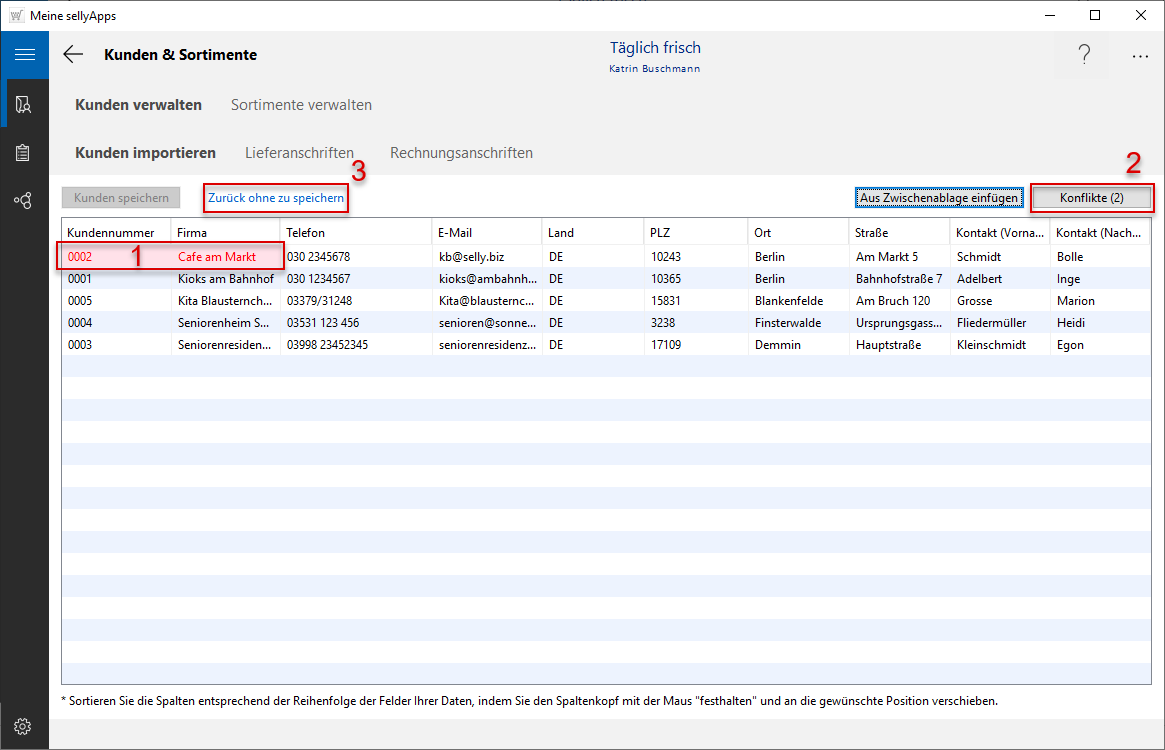 ist die Schalfläche [Konflikte (0)] inaktiv (s. Markierung 2). Somit können Sie jetzt den Import, durch Speichern der Daten, abschließen. Nutzen Sie