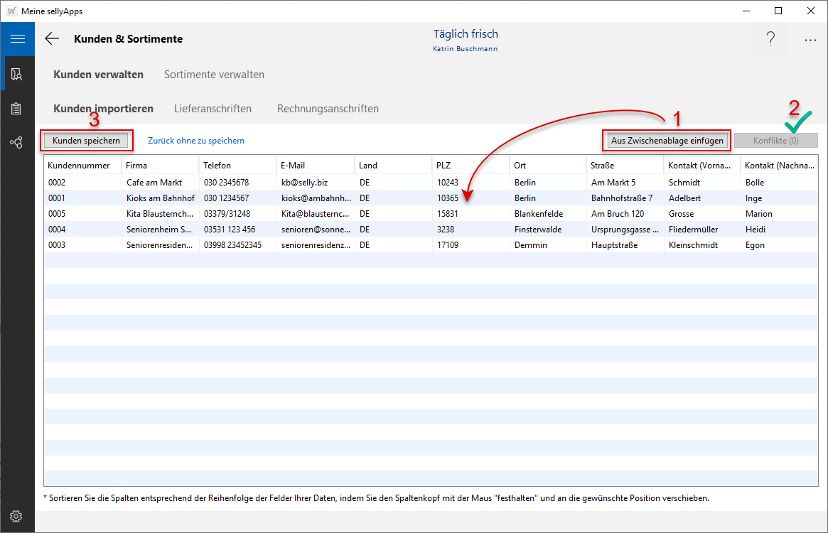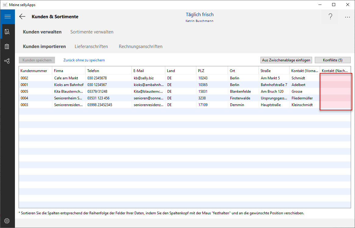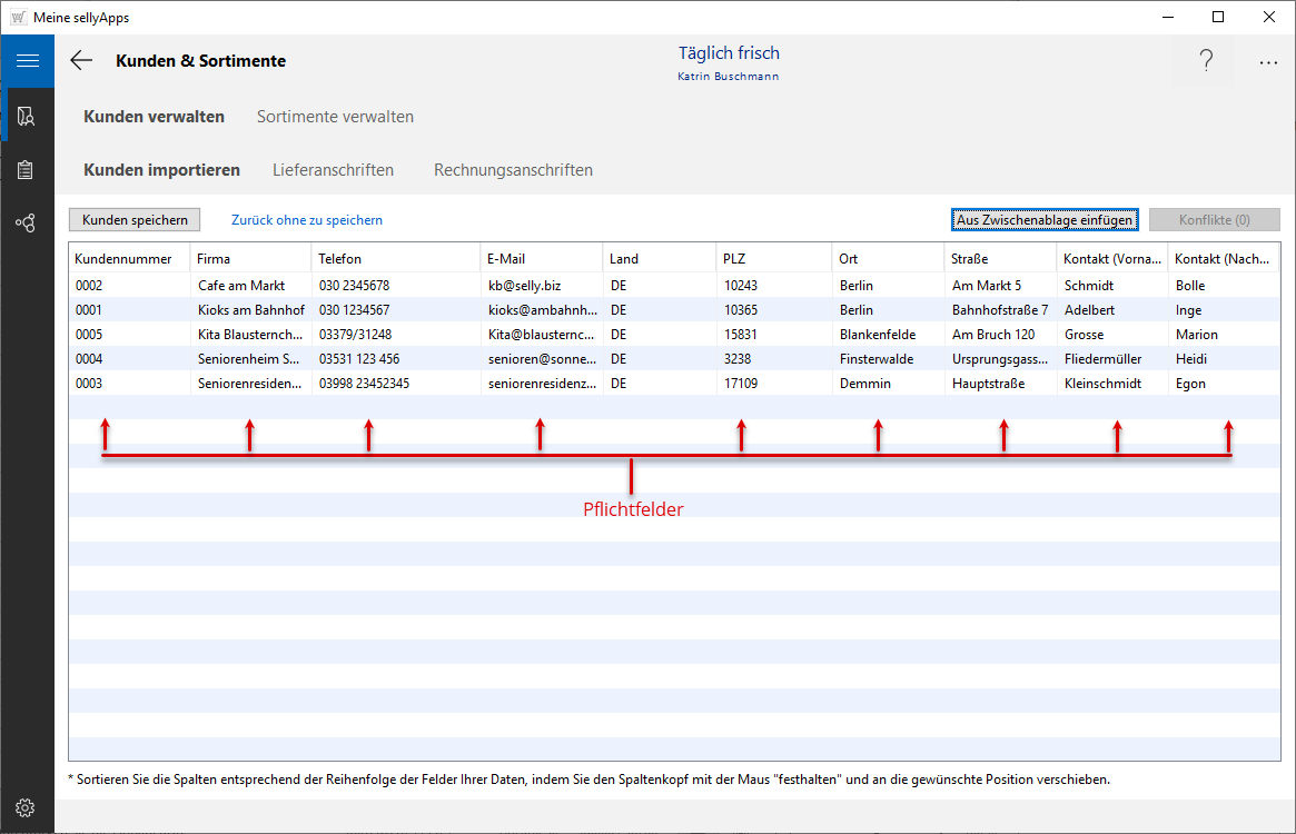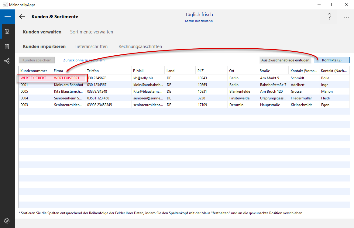 Beim Einfügen der Kundendaten aus der Zwischenablage, werden die Daten auf Vollständigkeit, entsprechend des selly-Datenformats überprüft. Haben Sie einen oder mehrere Werte eventuell in Ihrer Kundenliste (Excel) nicht mitmarkiert und somit nicht kopiert oder sind nicht alle notwendigen Kundenangaben vorhanden, ist dies ein Fehler.