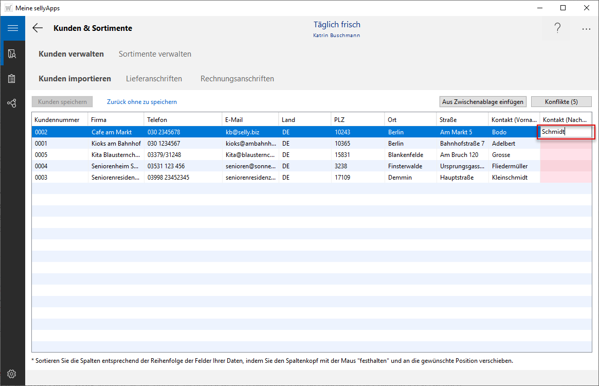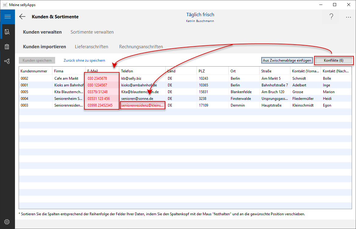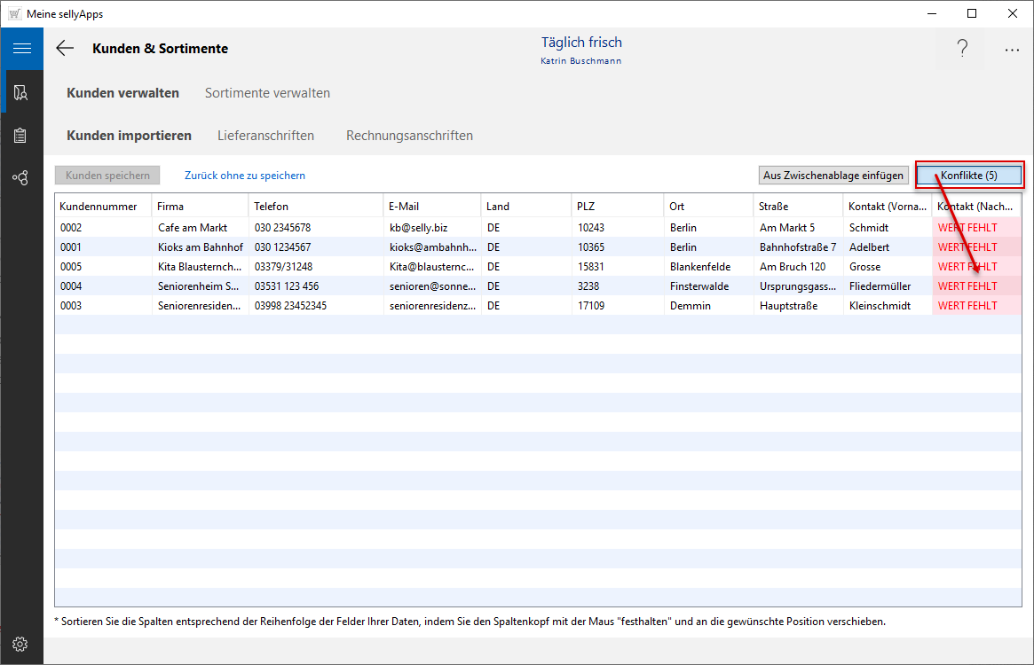 Die Fehlerbehebung können Sie entweder im Dialog Kunden importieren oder in Ihrer Datenquelle (Excel) vornehmen.
