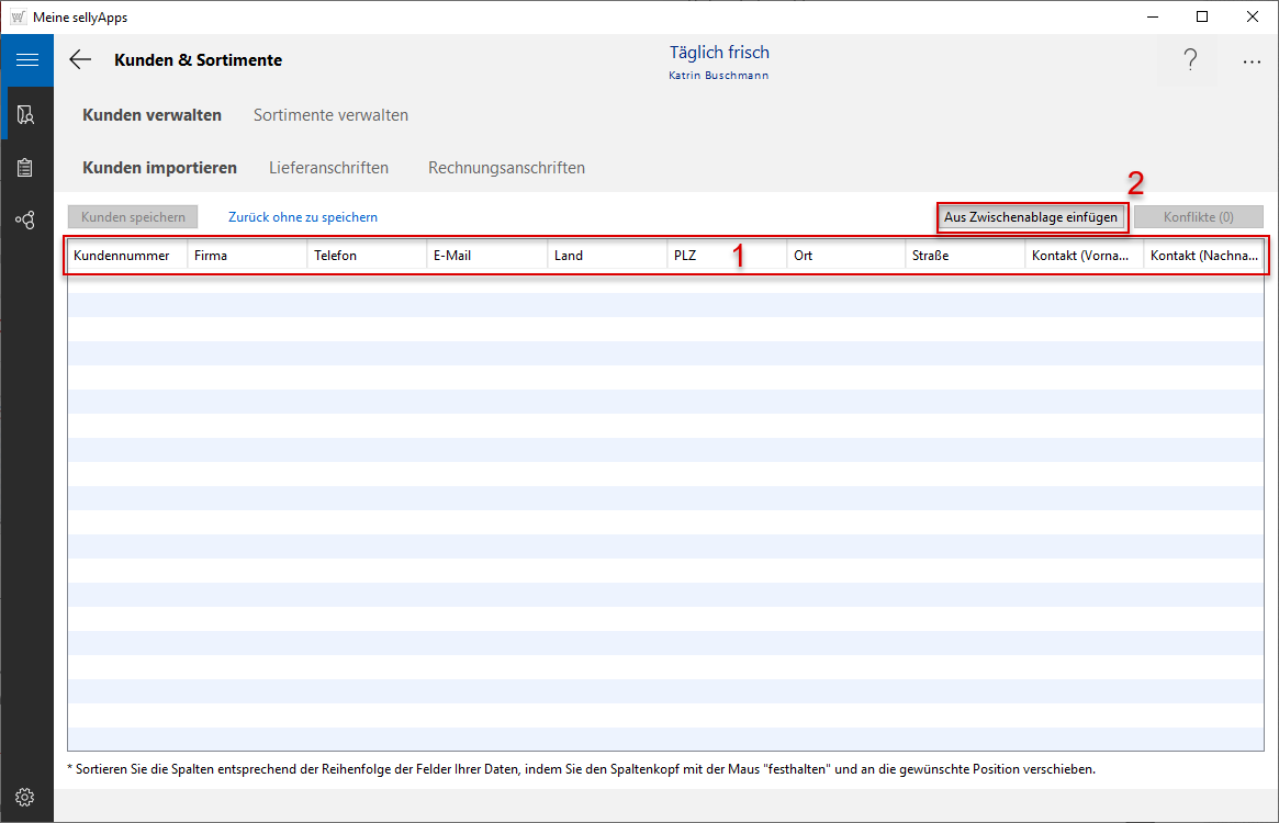 Zu Beginn des Importes von Kundendaten, nutzen Sie die Schaltfläche [Import...] im Bereich Kunden verwalten. Es öffnet sich der Dialog Kunden importieren (s. Bild links). Sie sehen die noch leere Tabelle mit den in der Reihenfolge vorgegebenen Spaltenköpfen (s. l. Markierung 1).