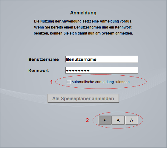 (s. o. Markierung 2 im Anmeldedialog) kann eine Skalierung des Textes in der Anwendung erreicht werden, um die Lesbarkeit