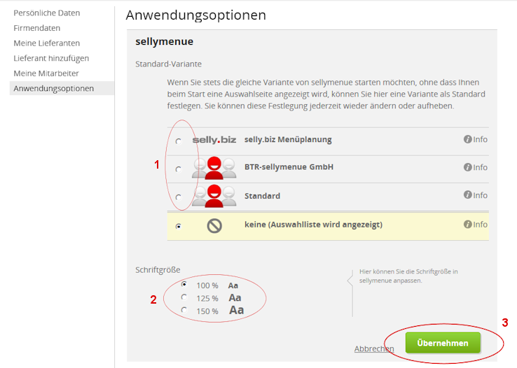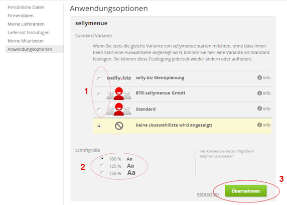 Um die Schriftgröße in sellymenue anzupassen, stehen Ihnen drei Größen zur Verfügung (s. Markierung 2). Sie speichern Ihre Optionen mit Klick auf [Übernehmen]
