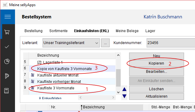 Im Bereich Einkaufslisten (EKL) markieren Sie die Kaufliste (s. Markierung 1), die Sie kopieren möchten, klicken auf [Kopieren] (s. Markierung 2) und erhalten einen neuen Eintrag in der Liste (s. Markierung 3).