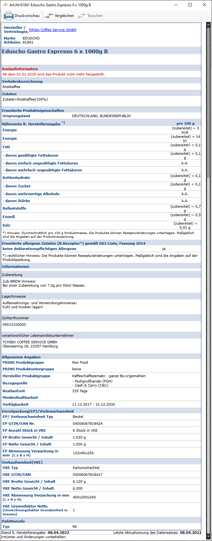 Mit dem Schalter Produktinfo (s. Markierung 8) können Sie die Anzeige der lagerrelevanten Informationen zu den einzelnen Artikeln ab- oder einschalten. Haben Sie einen Artikel markiert und diese Schaltfläche ist aktiv, können Sie sich hinterlegte Produktdaten (Beispiel) anschauen.