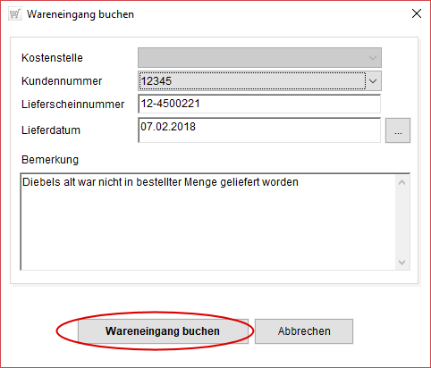 Nach Klick auf [Wareneingang buchen] erhalten Sie rechtsstehendes Fenster, können Daten, wie Lieferscheinnummer, Lieferdatum und ggfs. eine Bemerkung eintragen und nehmen abschließend den Buchungsvorgang mit erneutem Klick auf [Wareneingang buchen] vor.