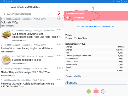 Markieren Sie einen Artikel, werden rechts im Fenster die Inhaltstoffe dargestellt. Sie können sich informieren und die Änderungen bestätigen (s. Markierungen 1).