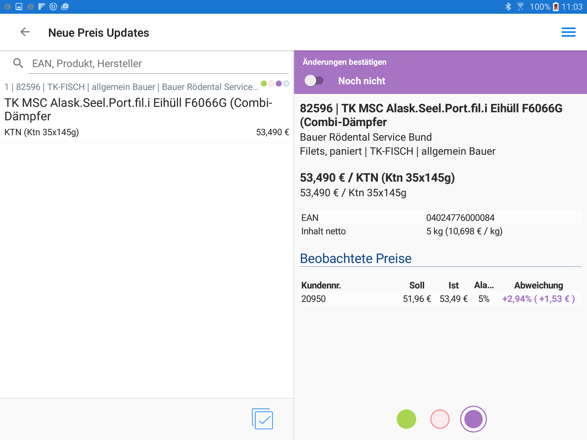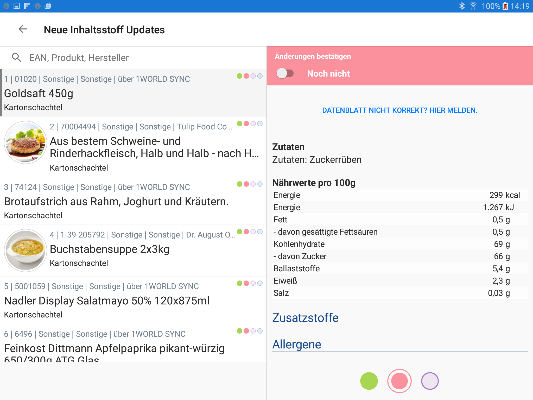 Klicken Sie auf der Startseite (Dashboard) direkt auf den Kreis, erhalten Sie die Auflistung aller Artikel, deren Inhaltstoffe geändert worden sind.