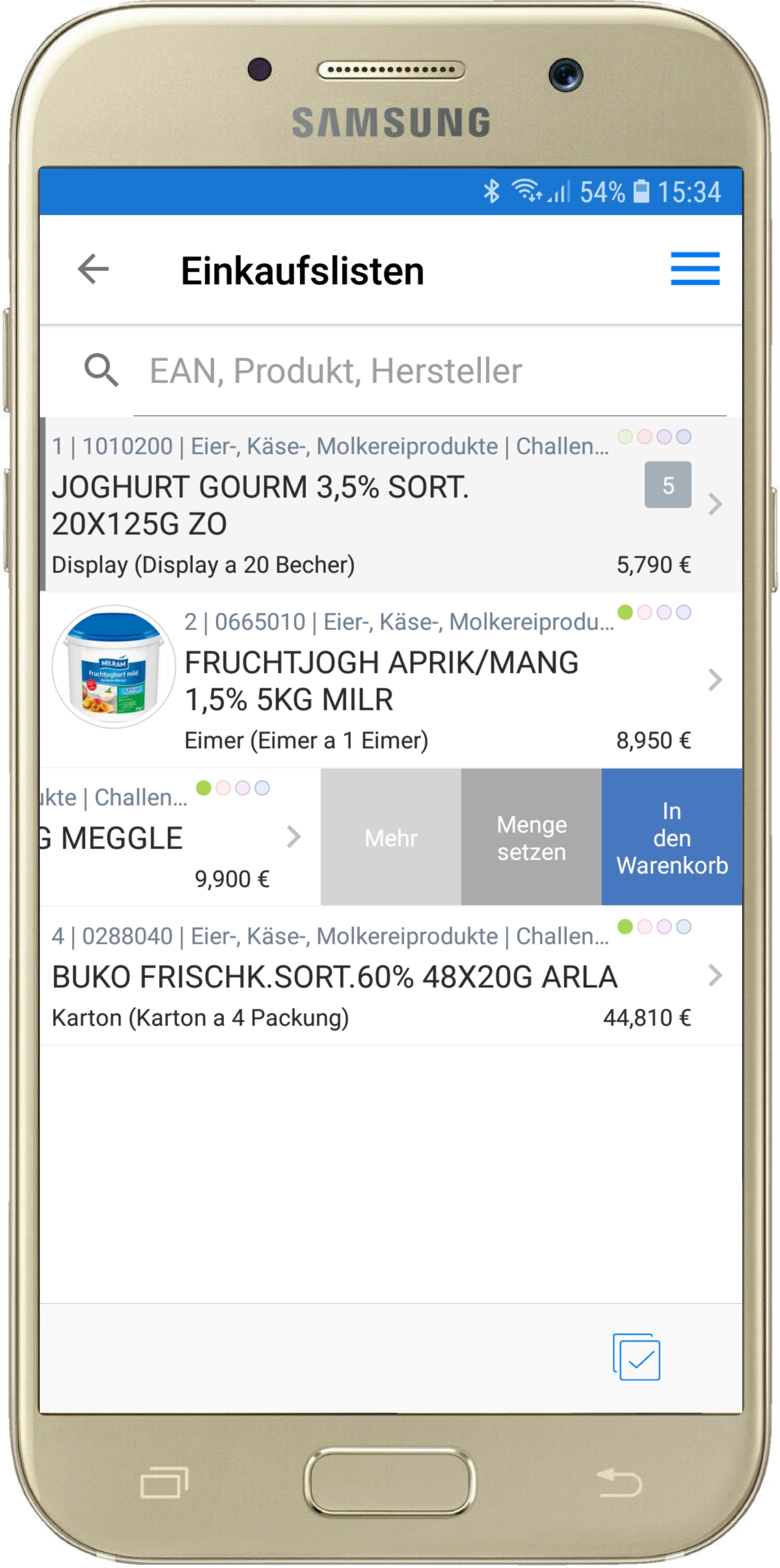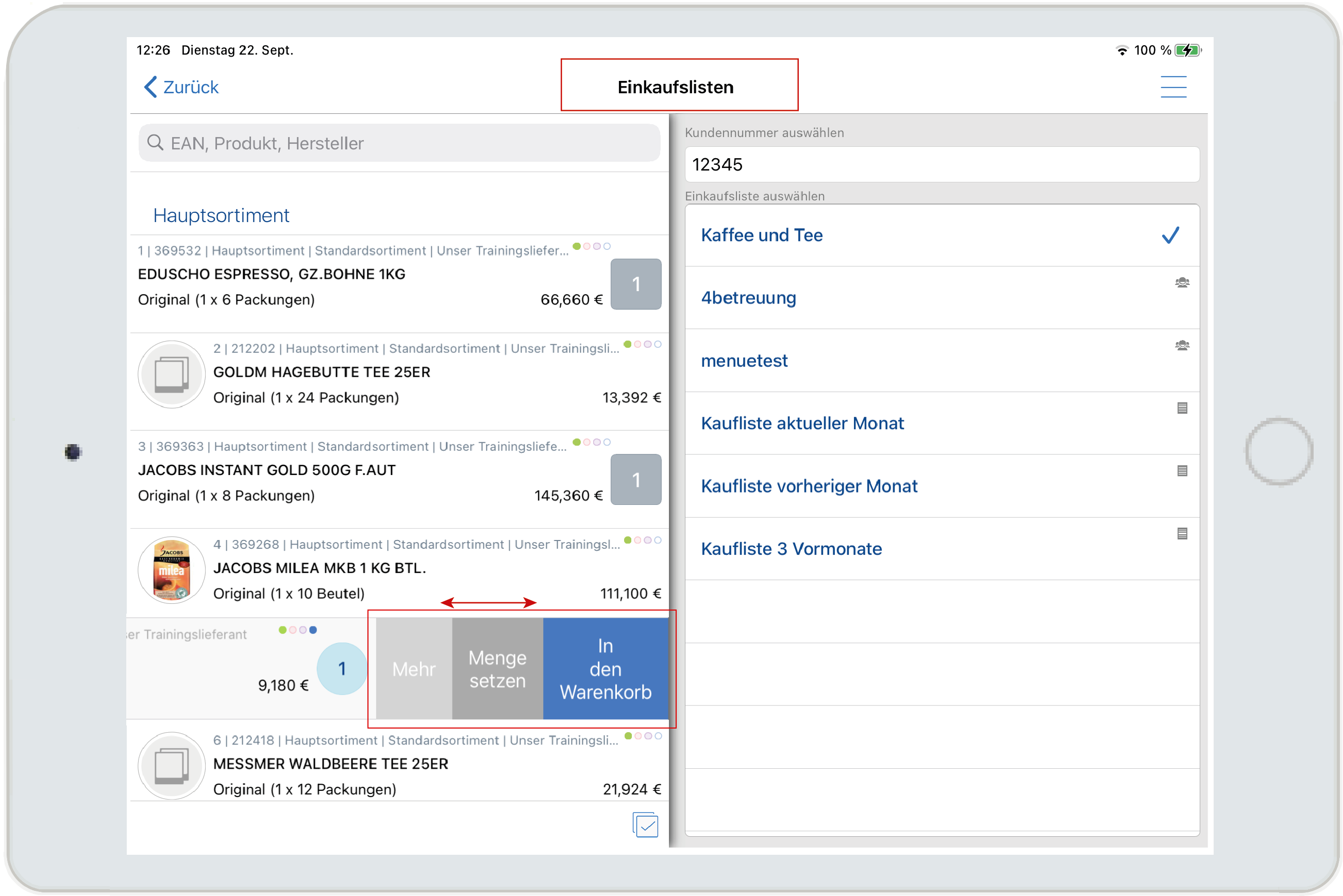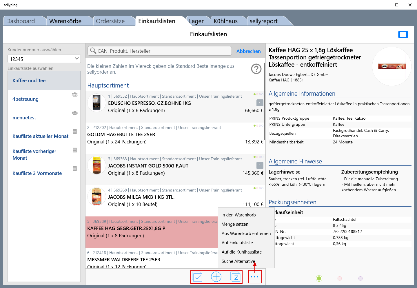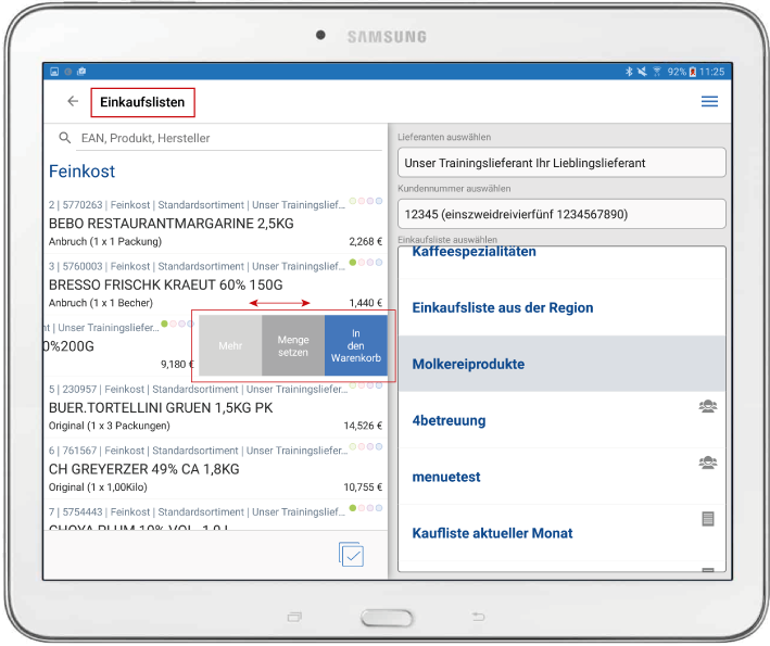 (Artikel in Einkaufs- und Kühlhausliste und Warenkorb übernehmen, Bestellmenge eintragen)