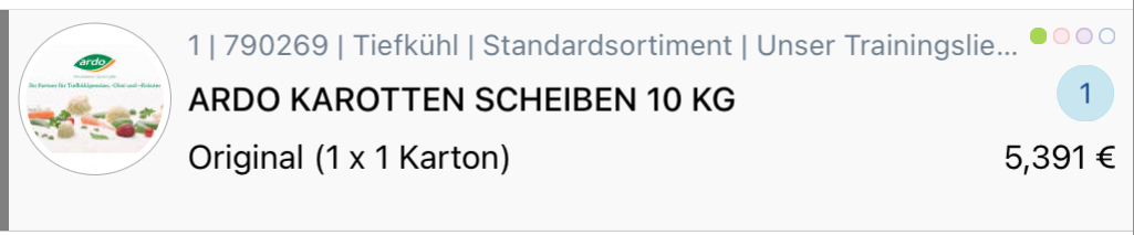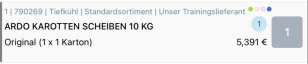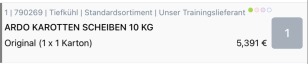 Die Artikelbezeichnung (ARDO KAROTTEN SCHEIBEN 10 KG), die Bestelleinheit (Original (1 x 1 Karton)) und der Preis (5,391 €) werden angezeigt.
