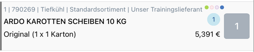 Oberhalb der Basisinformationen zum Artikel werden zusätzliche Daten angezeigt, wie die Listenpositionsnummer (1), Artikelnummer (790269), Sortiment (Tiefkühl, Standstandsortiment),